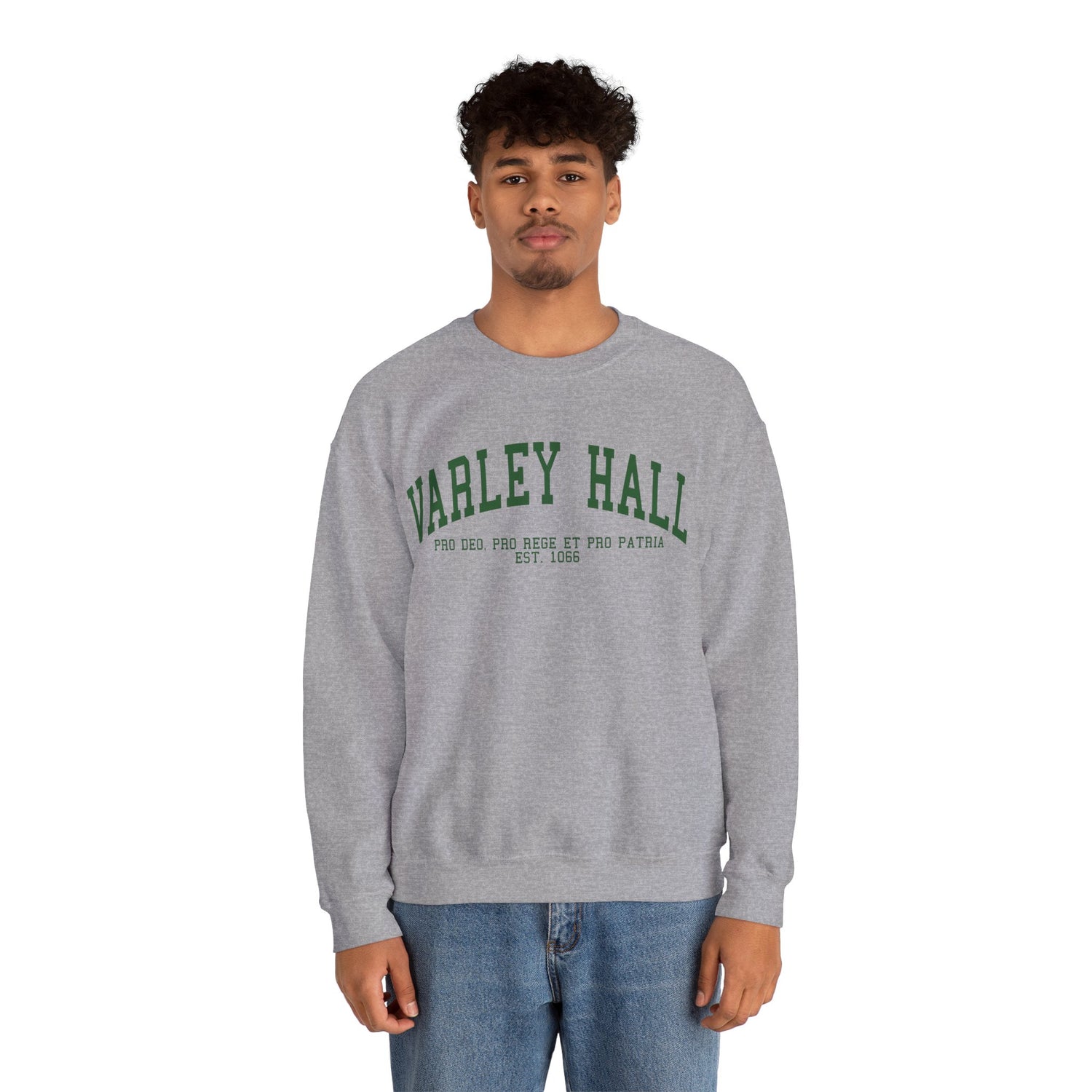 Rep the Varley Hall University Motto "For God, For King and For Country" with this varsity-style crewneck sweater.